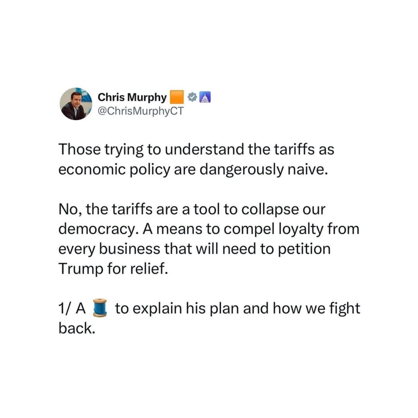 The tariffs are NOT about economic policy - it's an integral part of the destruction of democracy on the path towards authoritarianism. HE'S 100% CORRECT.