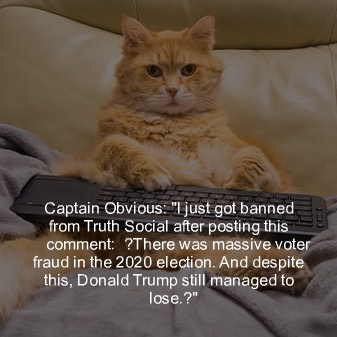 I just got banned from Truth Social after posting this comment: “There was massive voter fraud in the 2020 election. And despite this, Donald Trump still managed to lose.”
